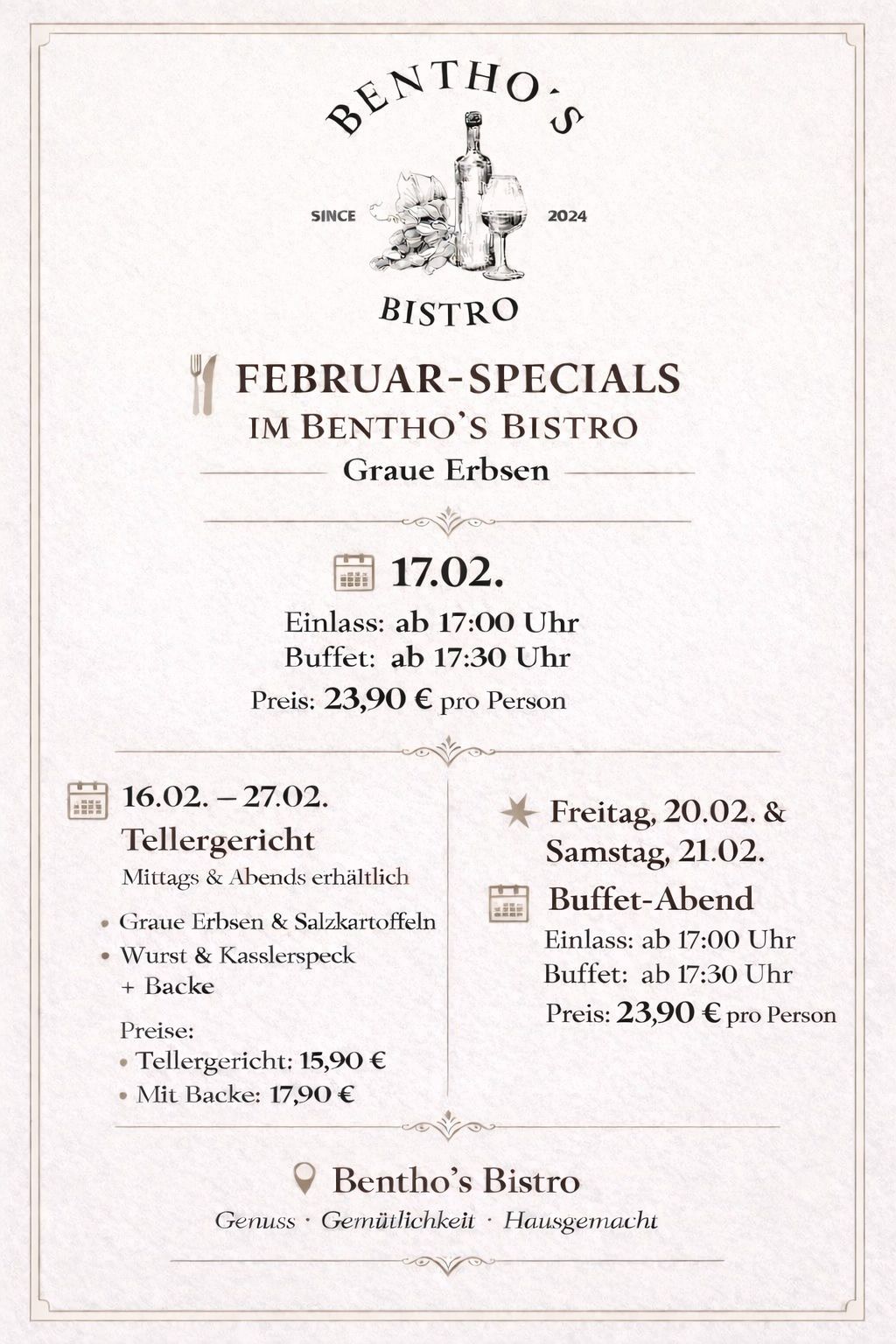 Am Samstag, den 14.02. aufgrund eines außer Haus Caterings Abends geschlossen! 14/02/2026 |